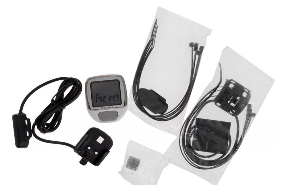 • Проводной велокомпьютер "Beetle-1" с пятью функциями в стильном корпусе, имеет отличную водо и пылезащиту, функции текущая скорость, дневная дистанция (обнуляется через 6 часов стоянки), общий пробег (одометр), время в пути, часы